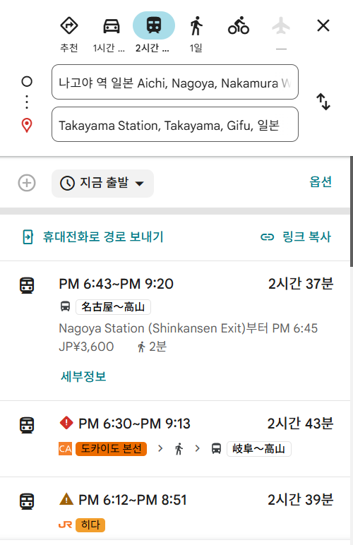 다카야마 가는법 (나고야 출발 기준)