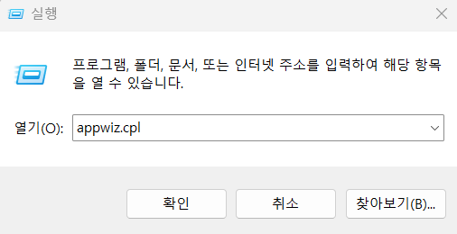 - 실행창에서 appwiz.cpl 입력 후 엔터