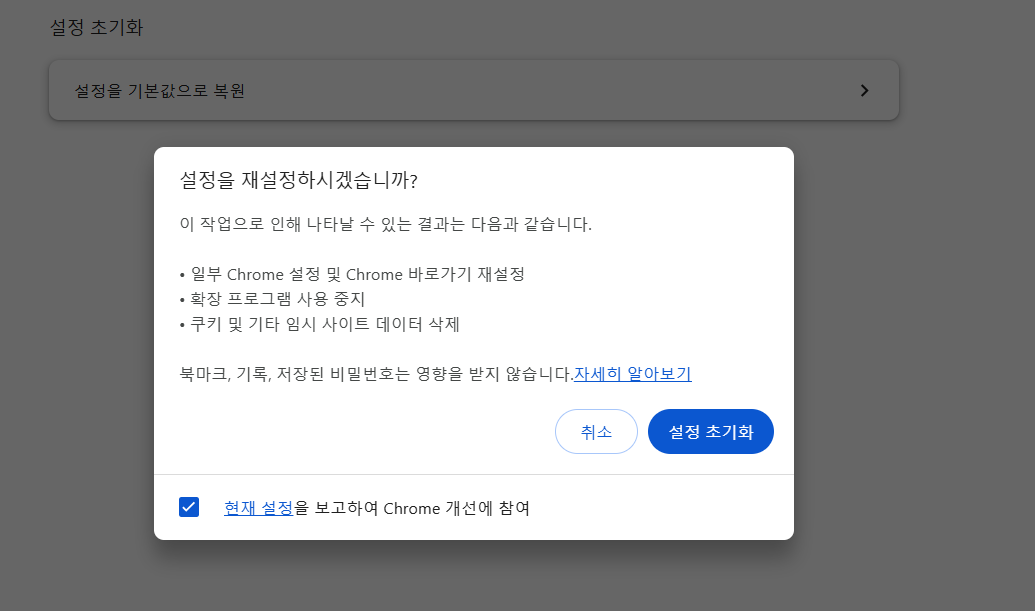 확장 프로그램 충돌이나 잘못된 설정이 원인인 경우 이 방법으로 해결되는 경우가 많습니다.