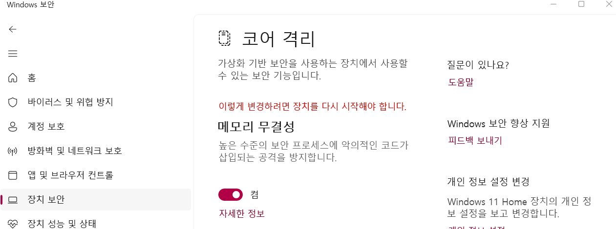 - 윈도우11 메모리 무결성 기능 사용 중
